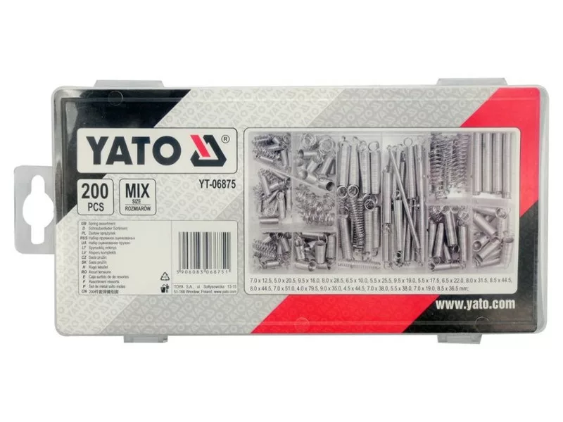 Set includesx200 springs (4x79.5 mm x12, 4.5x44.5 mm x8, 5x20.5 mm x10, 5.5x17.5 mm x10, 5.5x25.5 mm x10, 5.5x38 mm x10, 6.5x10 mm x10, 6.5x22 mm x10, 7x12.5 mm x10, 7x19 mm x10, 7x38 mm x10,