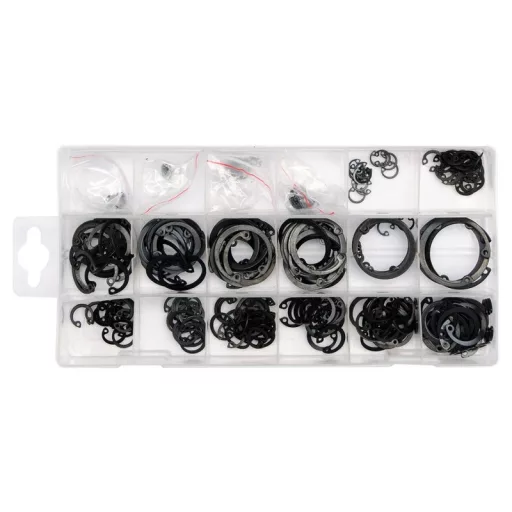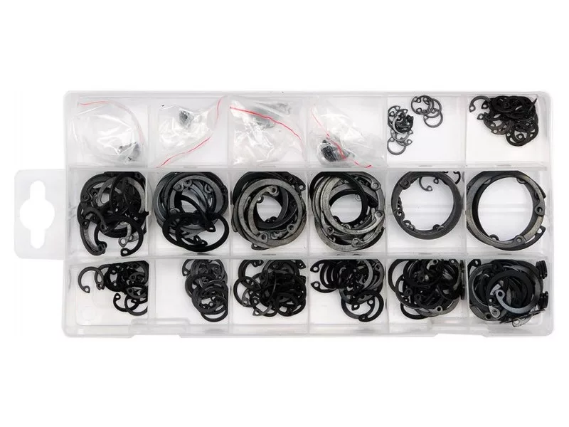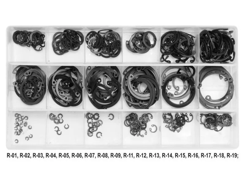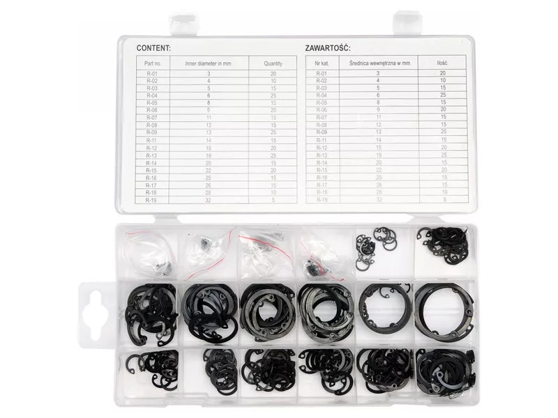 Set includesSeger rings inner x300 (Ø3 mm x20, Ø4 mm x10, Ø5 mm x15, Ø6 mm x25, Ø8 mm x15, Ø9 mm x20, Ø11 mm x15, Ø12 mm x15, Ø13 mm x25, Ø14 mm x15, Ø15 mm x20,