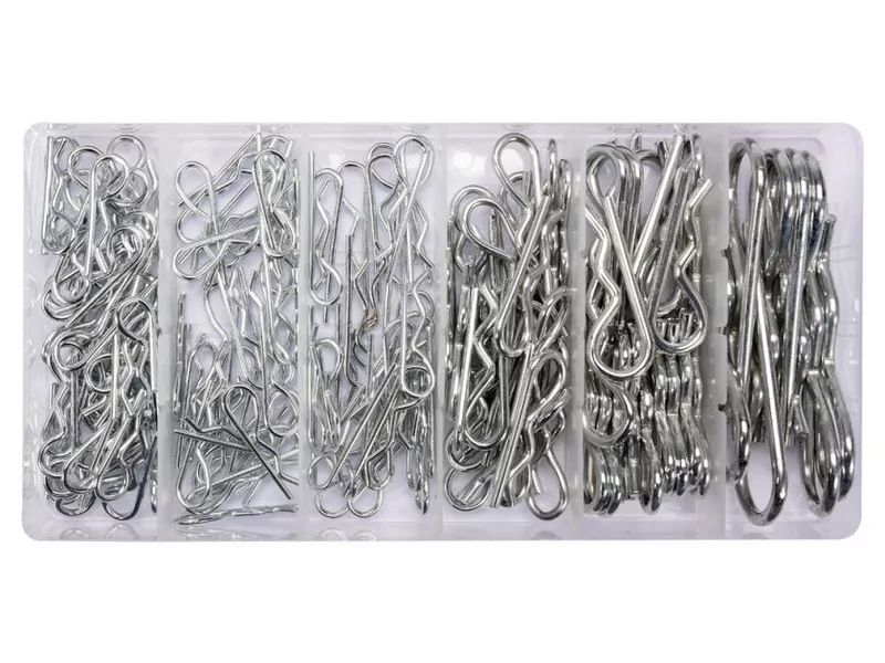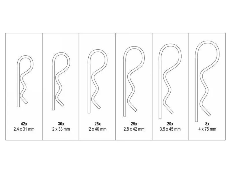 Set includesspring pins x150 (2x33 mm x30, 2x40 mm x25, 2.4x31 mm x42, 2.8x42 mm x25, 3.5x45 mm x20, 4x75 mm x8)