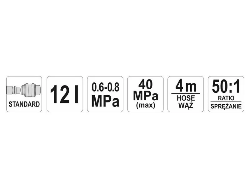 - Pump pressure at 8 bar of compressed air: 300-400 bar