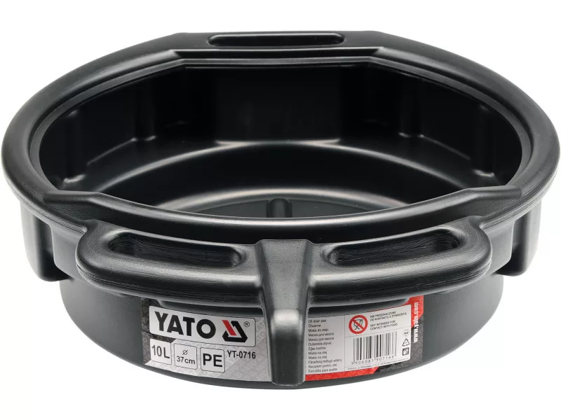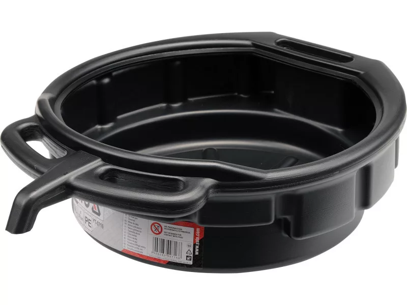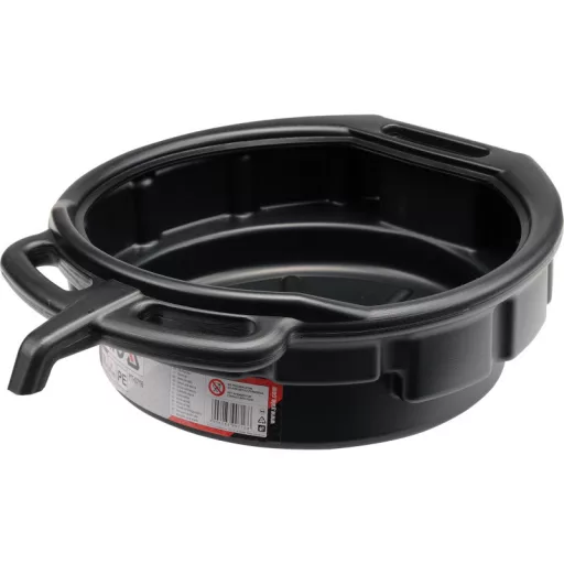 Bowl for pouring used oil or other operating fluids. Made of polypropylene, it has carrying handles and a contoured pouring area.Capacity: 10 liters.