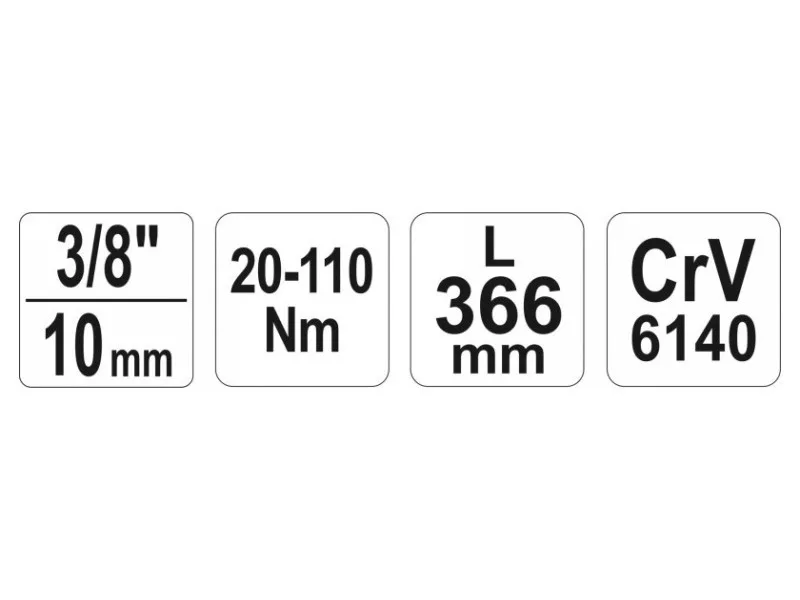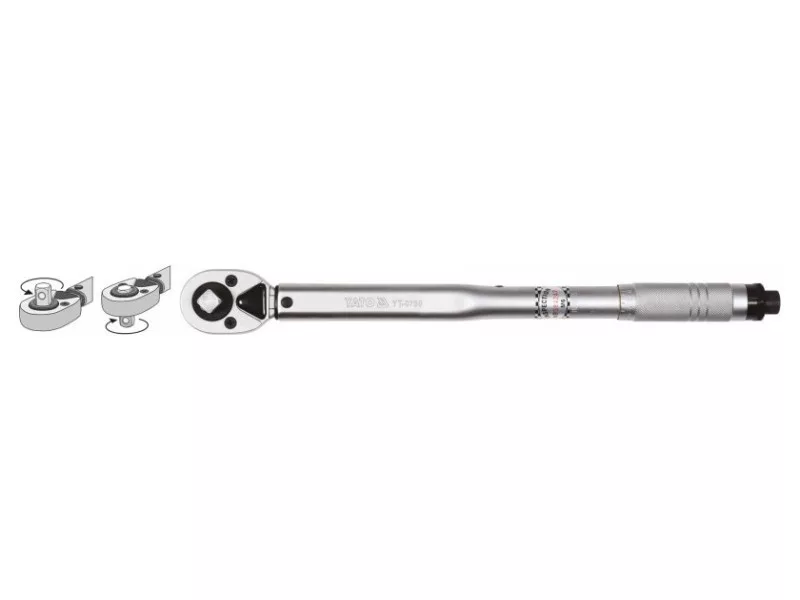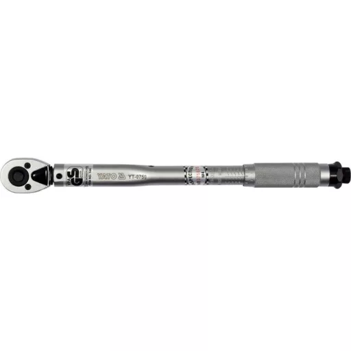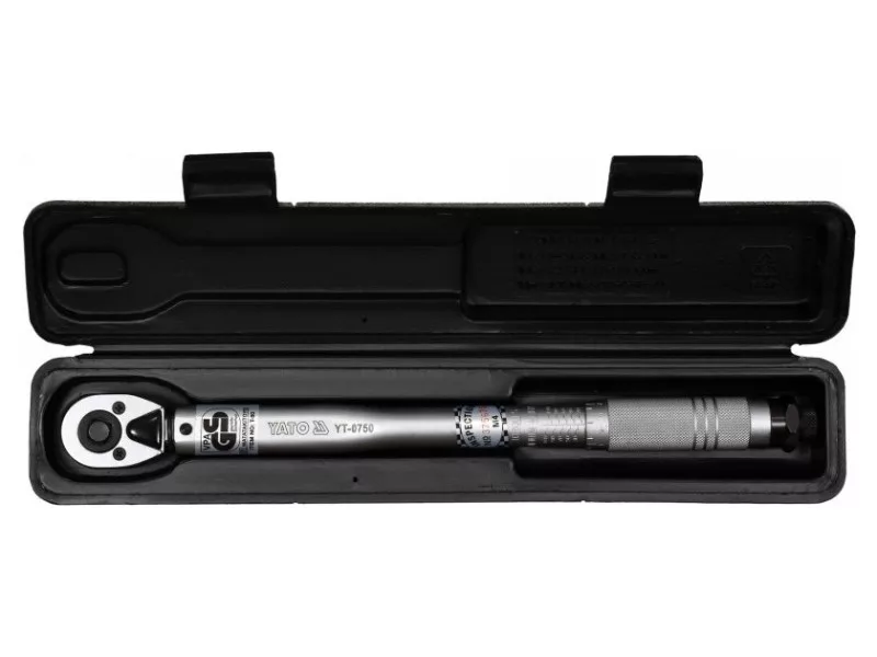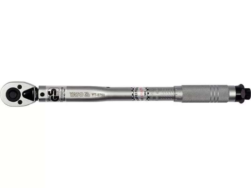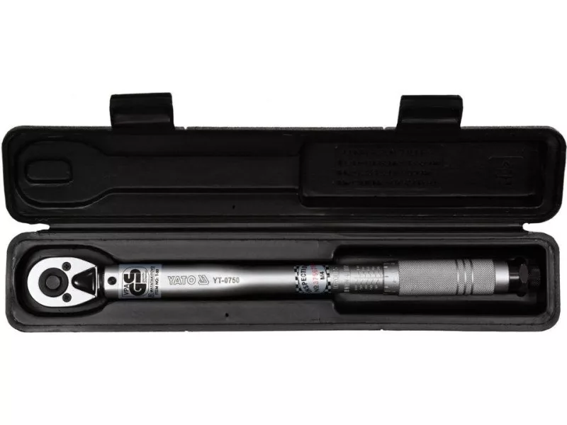 The wrench is made of chrome vanadium steel, which ensures its durability and strength. It has a mechanical tension of the torque pawl, whichóra after reaching the desired tightening force jumps one tooth, making a characteristic sound. The torqueós scale is located in the handle of the wrench, its adjustment is made by turning it. After setting the desired torque, lock the wrench with the safety catch at the end of the handle.The wrench is GS certified.Summary of torqueós in different units of length and force:1 kG*cm = 13.887 OZ*IN (ounce x inch)1 kG*cm = 0.867 LB*IN (pound x inch)1 kG*m = 9.80665 N*m (Niuton x meter)1 kG*m = 7.233 LB*FT (pound x foot)1 FT*LB = 12 LB*IN (pound x inch)1 dm*N = 14.16 OZ*IN (ounce x inch)