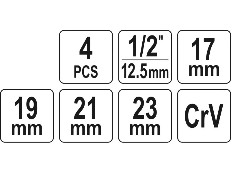 • chrome-plated sockets of 17 mm, 19 mm, 21 mm, 23 mm