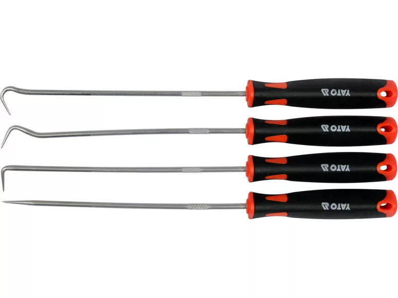 Set of hooksós with handle. The hooks have hardened and chrome-plated blades, made of 40 CR steel. The handles are made of two-component plastic to facilitate a secure grip.