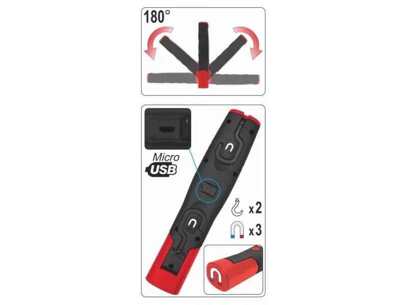 The rotatable housing enables the lamp to be tilted at any angle. Thanks to this feature and in addition two hooks and three magnets it can be easily and flexibly fixed. This gives you the opportunity to optimally illuminate the desired space while leaving your hands free.