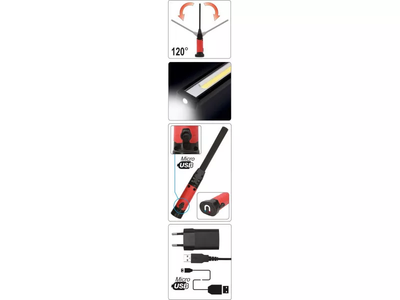 Functional 5W workshop lamp with a 3W flashlight placed on top. The light output of 600 lumens and 3 light modes guarantee efficient and comfortable work. The Magnet on the bottom allows the lamp to be attached to metal parts. The long, thin and adjustable top of the lamp will make it easy to enlighten hard-to-reach places.