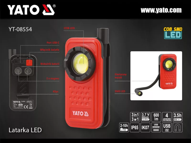 - 4 lighting modes 600 lm (COB high), 300 lm (COB medium), 150 lm (COB low), 50 lm (torch - SMD)