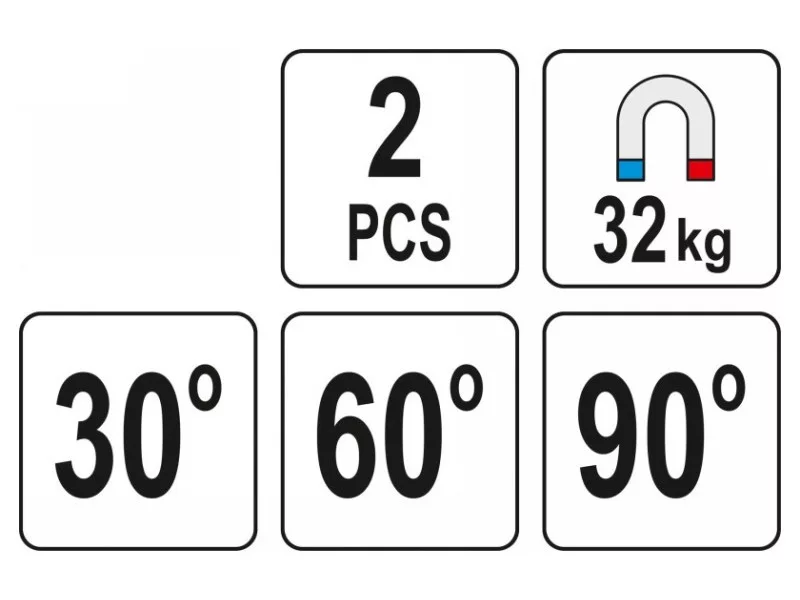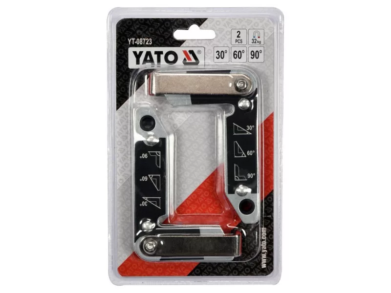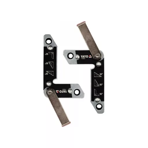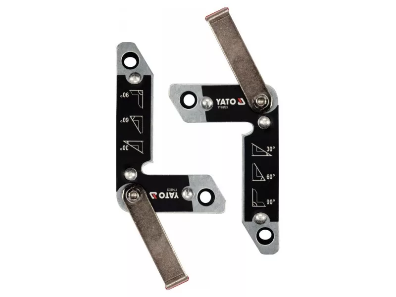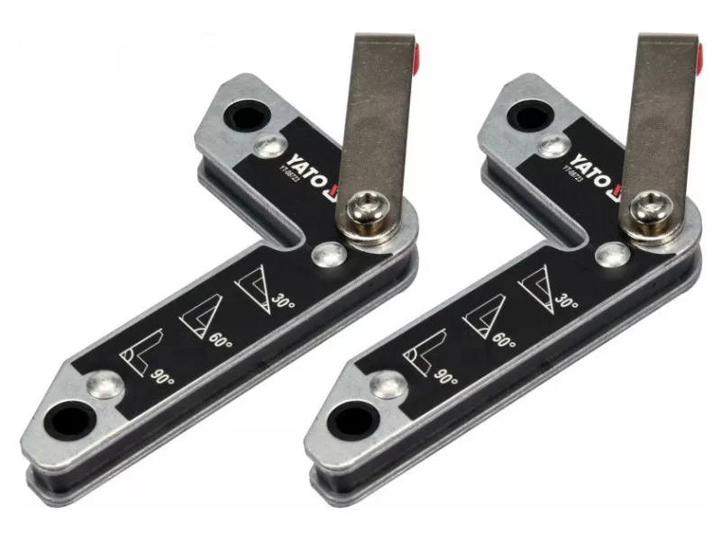 Set of 2 magnetic angleós YT-08723 used for welding work and angle assembly of various elementsós: metal sheets, connectorsós, flat barsós, profiles, pipes, etc. Provide secure holding of welded partsós thanks to strong magnets.