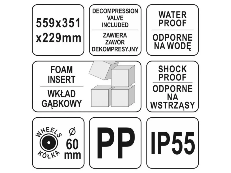 Hermetic, waterproof and dustproof case resistant to many chemicalsós and corrosion. Made of flexible polypropylene according to IP55 resistance class.It features an effective sealing system, enriched with a decompression valve for equalizing pressures during air transport.