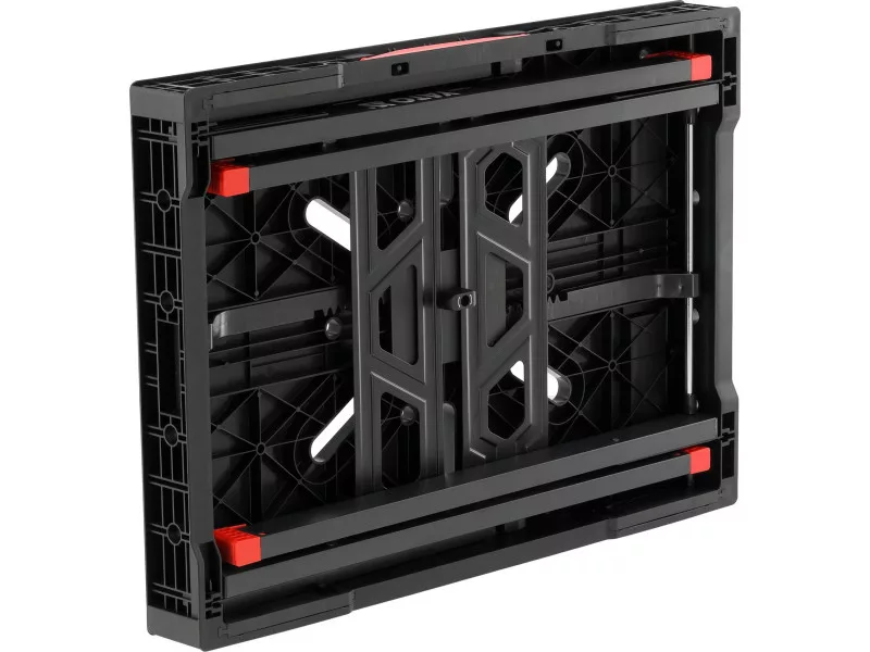 The 852 x 608 mm worktop is made of durable PP material, resistant to impacts and easy to clean. The construction combines metal and plastic, ensuring durability and safety even when loaded with weights up to 650 kg.