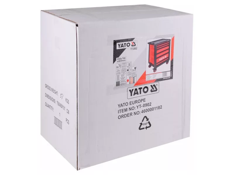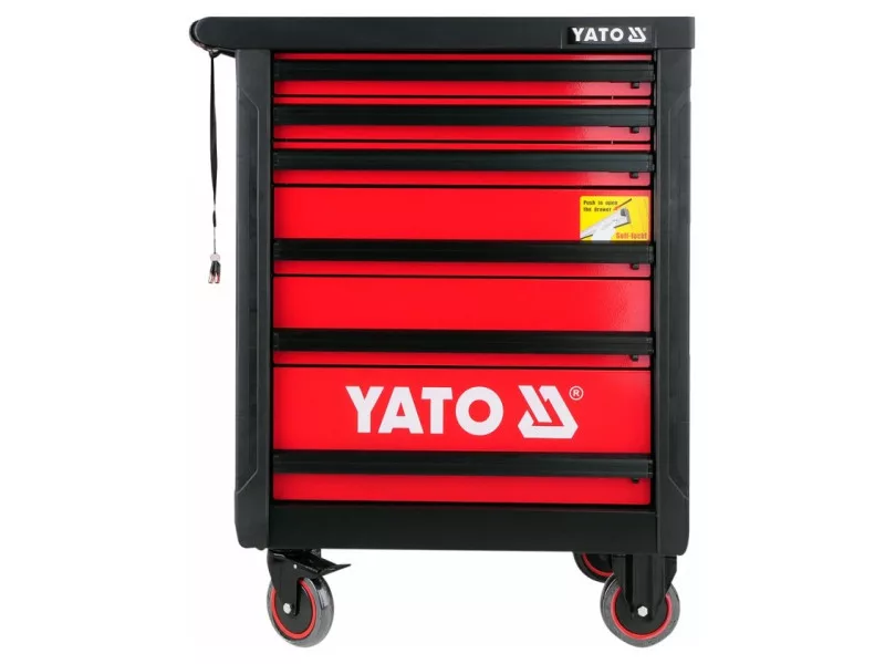 Yato service cabinet. It has 6 drawers on ball guides. Profiles made of double steel sheet. Central locking and individual closure for each drawer. The cabinet has corners that protect against accidental damage, e.g. car body. The top is made of polypropylene, withstands a load of 450 kg. Necessary in car workshops and vehicle service stations.