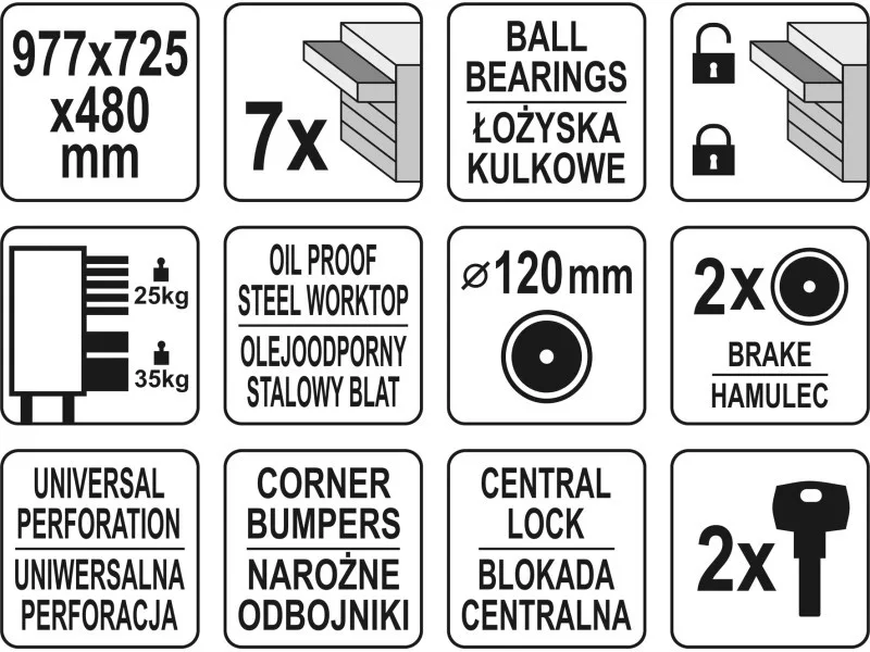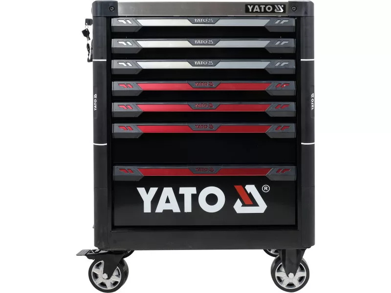 The new YT-09032 service cabinet is a unique design with a mechanism that locks the possibility of opening more than one drawer at the same time. All drawers work smoothly thanks to the use of special guides with bearings. The whole unit is locked with a central lock.