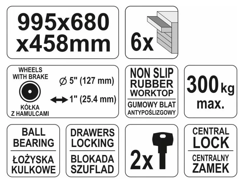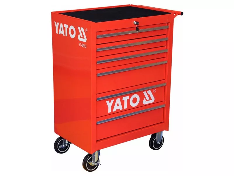 Yato service cabinet. It has 6 drawers on ball guides lined with foam. Profiles made of durable steel sheet. Oil -resistant top -resistant top. The cabinet has large rubber wheels, including two rotary with protection. Resistant to high loads up to 300 kg. Necessary in car workshops and vehicle service stations.