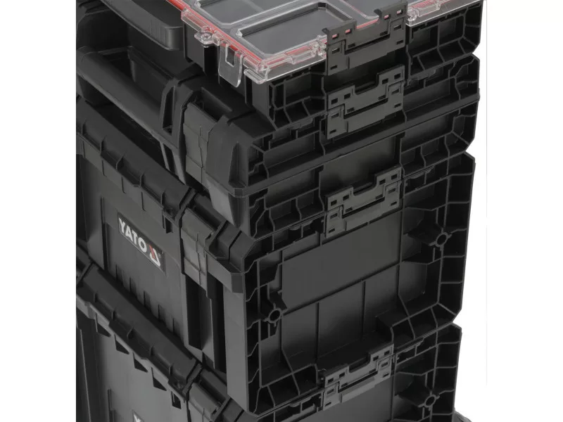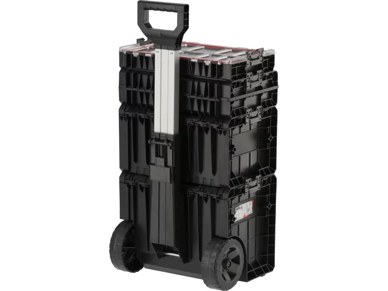 The whole is a 4 element mobile set on wheels with telescopic handle, it has large rubber-covered wheels mounted on a metal axle. In addition, the safety of transported tools is also taken care of by solid fasteners and side connectors made of strong polyamide. Flexible seals installed in the lids ensure splash-proof , which protects the contents from splashing and dust.