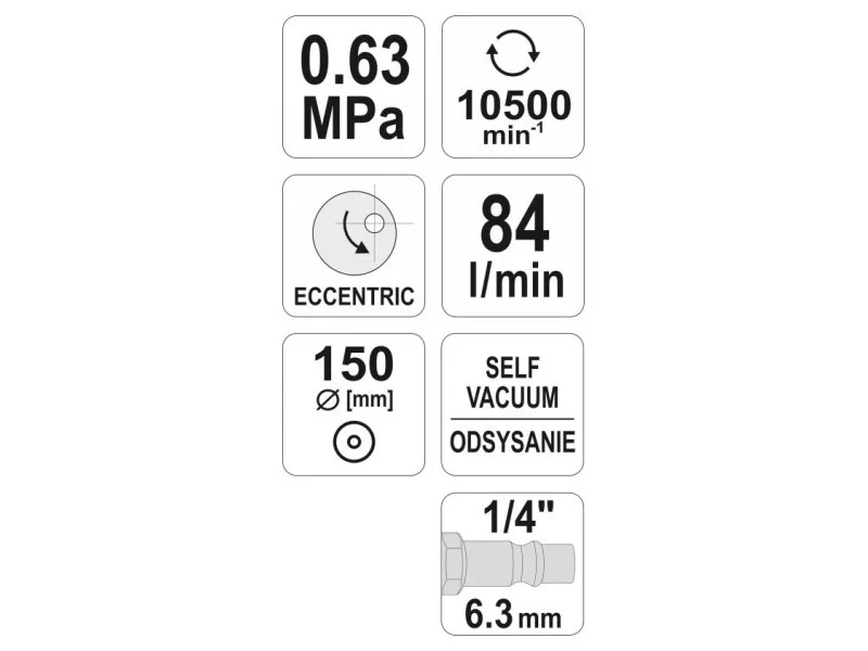 bag for waste.The 5mm oscillation provides optimal surface treatment.With abrasives applied directly to the discs, it is possible to grind and polish a variety of materials.The grinder is equipped with a connector that allows you to connect it to the pneumatic system. The grinder is equipped with a