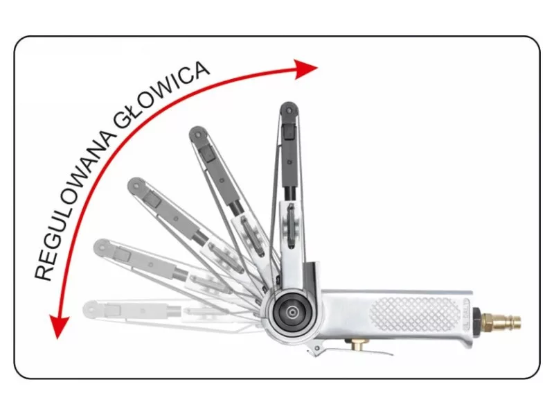 Set includespneumatic belt grinder, hose connector, sanding belt x3 (P60, P80, P120)