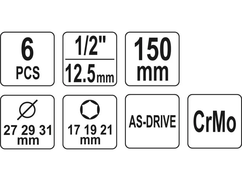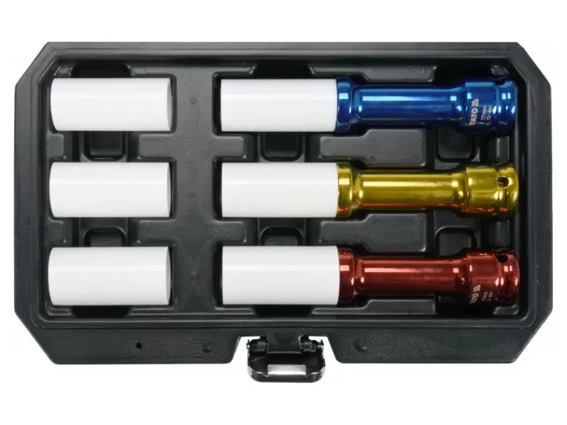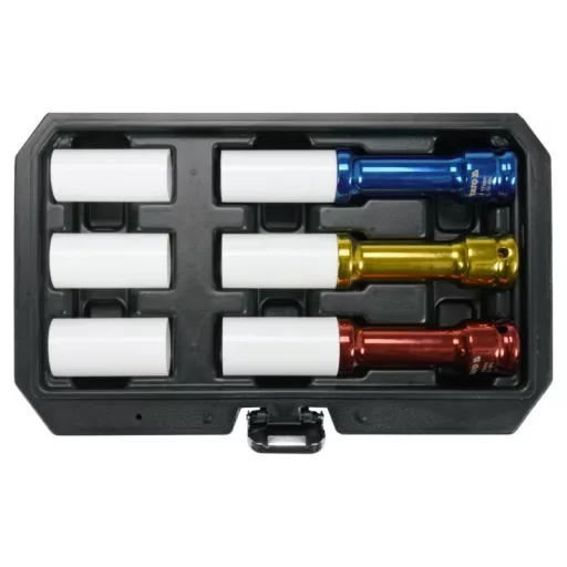 6-piece set of long impact sockets designed for removing aluminum rims. Recommended for automotive and tire serviceós.