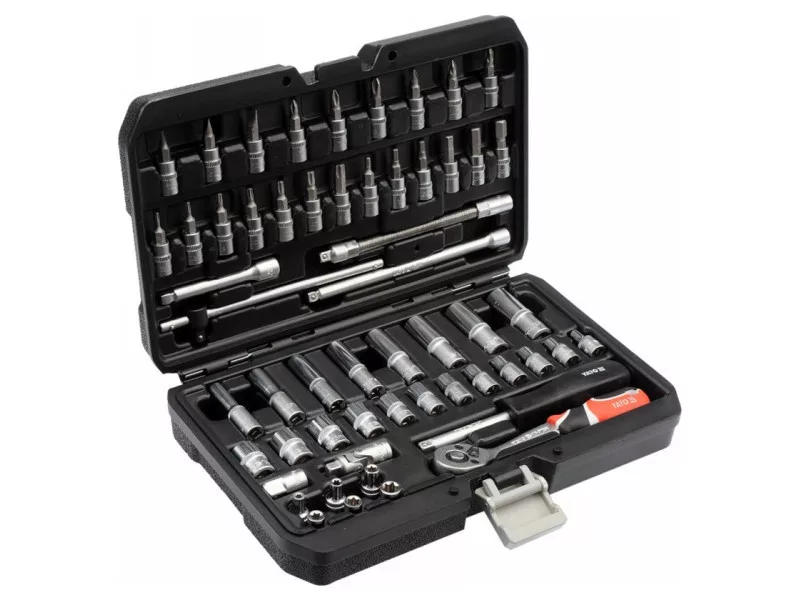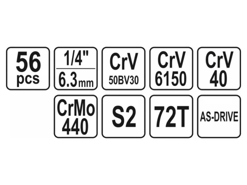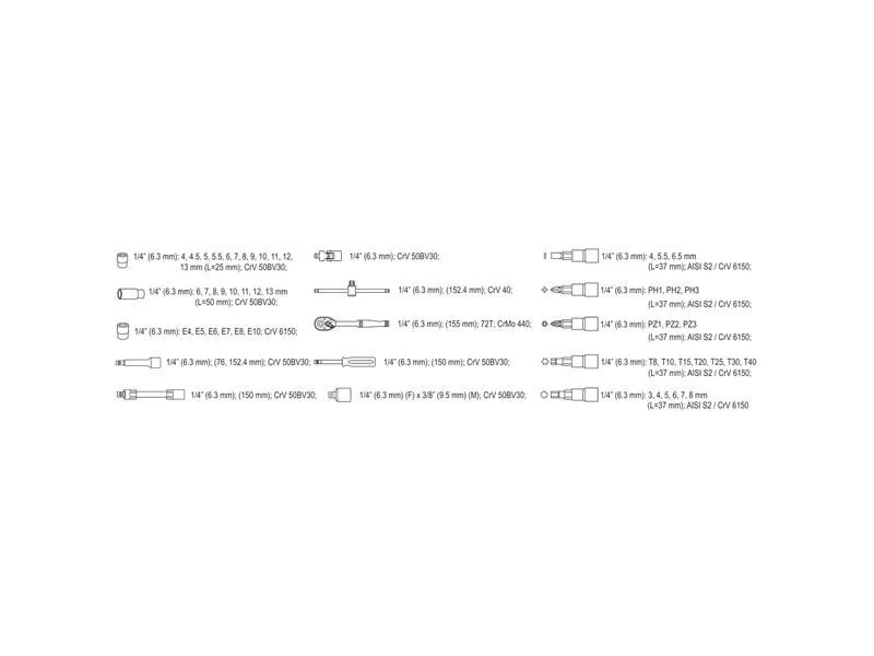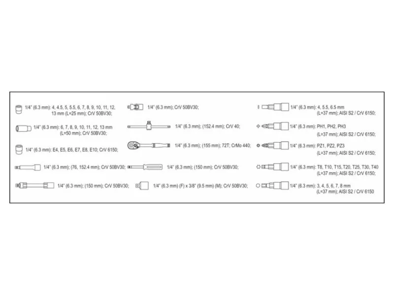 A professional tool set, which was developed for the needs of specialized car and mechanical services. The socket wrenches and the drive of the attachment were made of durable, tool-vanadium steel CRV 50BV3. The attachments were made using the matrix method, and before the hardening process they were calibrated with precise fittings and control devices. The set enables work that requires very high loads and precision, allows you to perform many service activities related to unscrewing and screwing threaded connections of various nominal sizes. Rattle 72 teeth (working stroke 5 degrees). 1/4 "attachments: 4; 4.5; 5; 5.5; 6; 7; 8; 9; 10; 11; 12, 13 mm, l = 25 mm, 6; 7; 8; 9; 10; 11; 12; 13 mm, L = 50 mm Torx attachment: E4; E5; E6; E7; E8; E10 extensions1/4 ", 76mm, 152.4mm reduction 1/4" "(f) x 3/8" "(m) extension flexible 1/4 ", 150 mm ratchet 1/4": 150 mm; 72T 1/4 "screwdriver, 150 mm Sliding knob 1/4": 150 mm Cardana1/4 "Adapter for the ends of the Philips Cross screwdriver: PH1; PH2; PH3; PH3 Cross screwdrivers Nonincles: PZ1; PZ2; PZ2; PZ3; PZ3 Flat screwdriver : 34; 5.5; 6.5 mm Six -legged screwdriver: 3; 4; 5; 6; 7; 8 mm Allen keys HEX: 1.5; 2; 2.5 mm Torx screwdriver: T8; T10; T15; T20; T25; T30; T40 Suitcase
