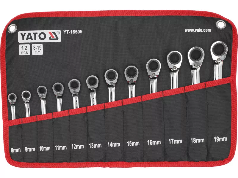 Set of 12 ratchet combination spanners. The case facilitates convenient access and keeps the workshop tidy.
