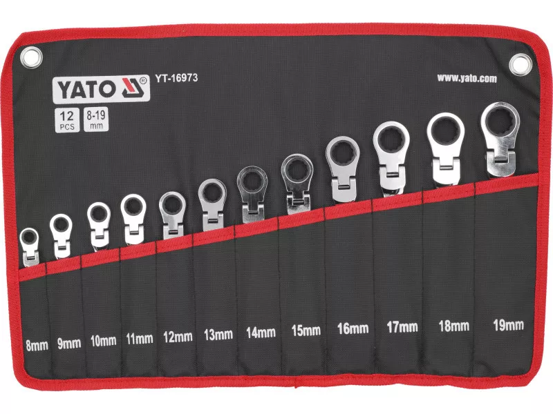 Set of 12 combination spanners with ratchet and joint. The joint allows the spanner to be used in hard-to-reach areas. The case makes it easy to conveniently access the keys and keep the workshop tidy.