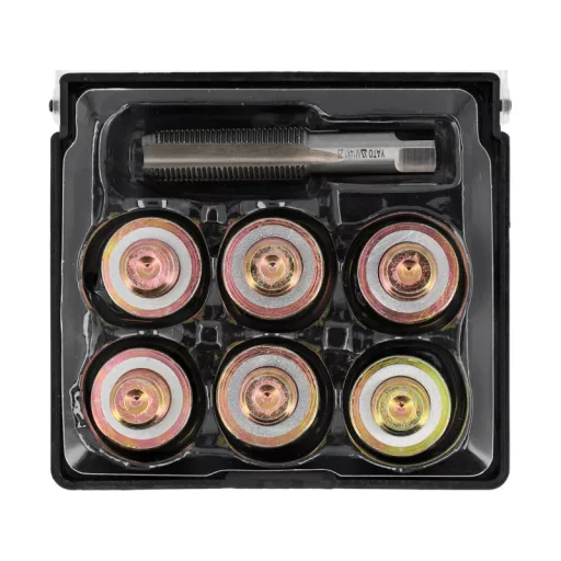 Kit for the simple repair of oil pan drain plug threads, gearboxes, etc. Fits most threads commonly used on cars and light trucks.