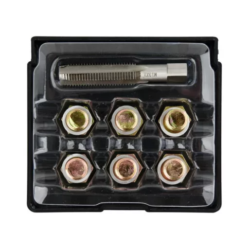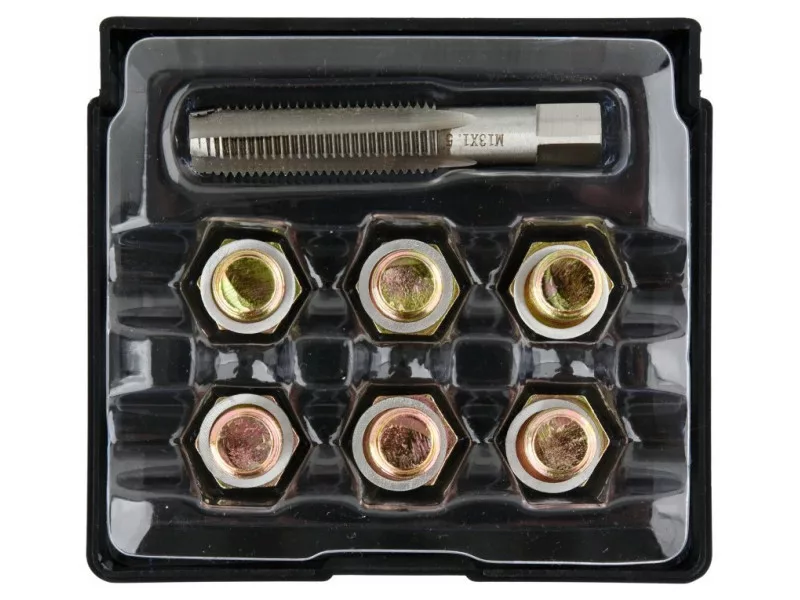 Kit for simple repair of oil pan drain plug threads, gearboxes, etc. Fits most threads commonly used on cars and light trucks.
