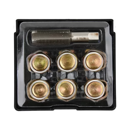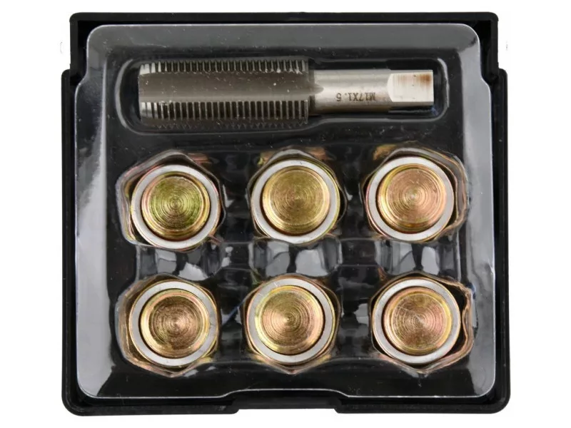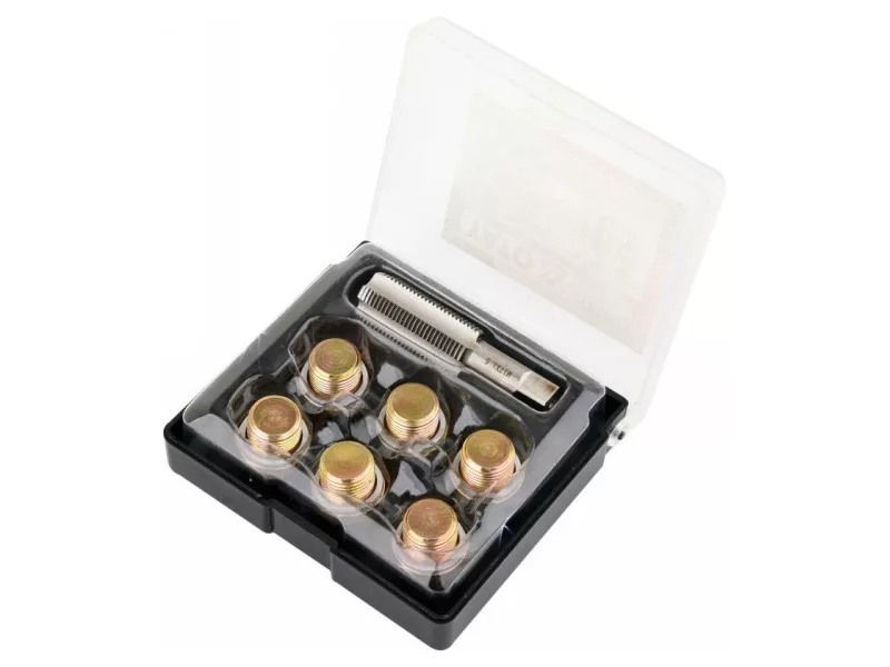 Kit for simple repair of oil pan drain plug threads, gearboxes, etc. Fits most threads commonly used on cars and light trucks.