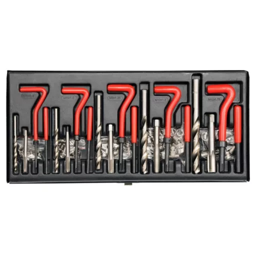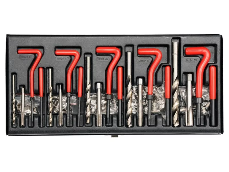 Professional M5-M12 thread repair kit. The drills and taps are made of HSS 4341 high-speed steel. The single-stage taps cut a thread into which a hard stainless steel spiral insert is inserted. A guide knob is used to insert the insert, as well as a drift that breaks off the protruding end of the insert The set is designed for 5 types of threads: M5 x 0.8 x 6.7 mm, M6 x 1.0 x 10.8 mm, M8 x 1.25 x 10.8 mm, M10 x 1.5 x 13.5 mm, M12 x 1.75 x 16.3 mm. - Determine the size of the damaged thread, and then select a repair kit of the same size- Ream out the damaged thread with a drill bit from the kit- Then thread it with the tapping tool included in the kit. The tapping tool should be seated in the knob designed for threading machines. The knob is not included in the kit equipment- On the knob for spiral inserts, seat the insert so that the transverse part of the insert is in the the slot of the knob. Then secure the insert with a ring so that it does not stretch during screwing. Secure the ring with a screw- Screw the insert completely into the pre-threaded hole. Slide out the knob. Using a cotter pin Break off the transverse part of the insert- Screw the screw into the repaired thread. - Drills for reaming the damaged thread: 5pcs- Single-stage taps for making the thread for the new insert: 5pcs- spiral inserts: 5 packets - knobs for screwing in spiral inserts: 5pcs- drifters: 5pcs- allen wrench: 1pc- case