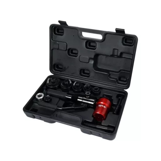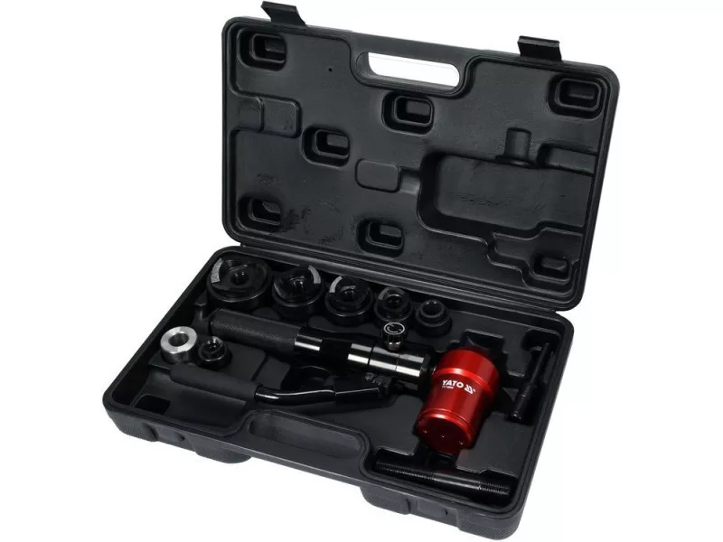Set for cutting round holes in sheets in the diameter range from 22-60 mm. The head of the hydraulic actuator can be rotated 360 degrees. It is intended for cutting holes in the production of resolution cabinets for mounting cans or switches. When cutting the holes, the surface of the sheet is not deformation and damage. The set is easy to transport- packed in a durable suitcase. Contains matrices and stamps cutting holes with diameters 22 mm/0.9 ", 27.5 mm/1.1", 34 mm/1.3 ", 43 mm/1.7", 49 mm/2.0 ", 60 mm/2.4 ". The emphasis on the material during cutting is about 6 tons. Suitable for cutting holes in steel sheets, stainless sheets and colored metals. The thickness of the cut material depending on its type up to 3 mm. The set includes 6 pairs of dies/stamp and matrix/fi 22, 27.5, 34, 43, 49, 60 mm, 2 puffs for fastening 7/16x3/4 inches and 3/4x3/4 inches, manual actuator and 1 sealing set for quick cutting in sheet metal, large, precise holes with diameters from 22-60 mm in accordance with the instruction on the user manual. Transfer the appropriate fastener connected to the actuator through the drilled material, mount the stamp on it on one side on the other. . Manual cylinder with rotating head, cutting stamps 22 mm/0.9 ", 27.5 mm/1.1", 34 mm/1.3 ", 43 mm/1.7", 49 mm/2.0 " , 60 mm/2.4 matrices suitable for stamps- 22 mm/0.9 ", 27.5 mm/1.1", 34 mm/1.3 ", 43 mm/1.7", 49 mm/2 , 0 ", 60 mm/2.4 Plays for fastening 7/16x3/4 inches and 3/4x3/4"., Sealing set packed in a suitcase.