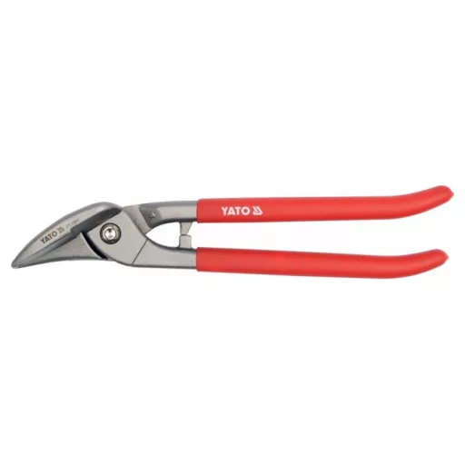 Professional roofing shears for cutting sheet metal, forged made of high-carbon steel, inductively tempered jaws to 58-61HRC hardness, surface finished with sandblasting. Handles covered with covers with hard, slippery vinyl.