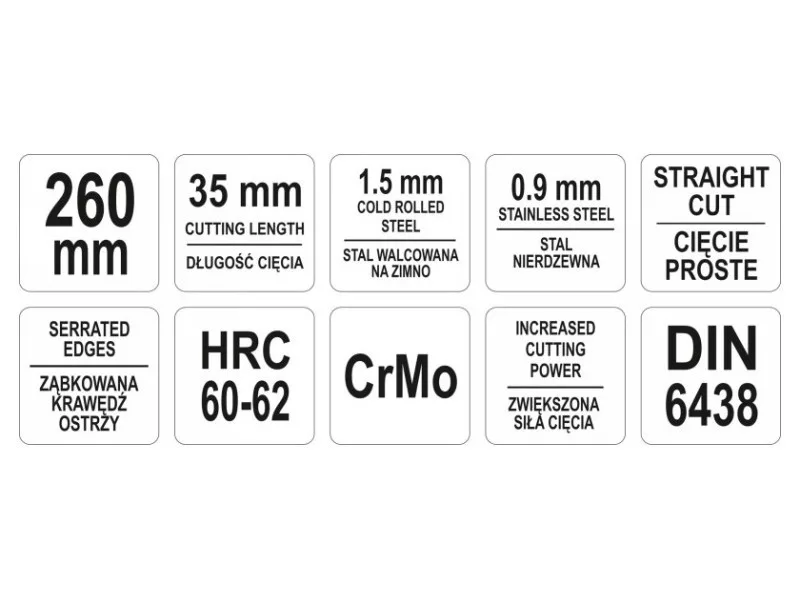 Professional, manual sheet cutting scissors. Jaws dusted from molybdenum steel /crmo /, hardened to approx. 60-62 HRC, induction hardened. For cutting steel sheets up to 1.5 mm thick and stainless steel up to 0.9 mm thick. Total length 260 mm. Profile - simple.