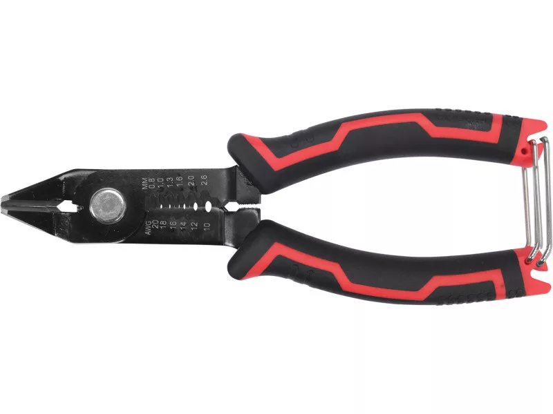YATO YT-19695 cutter with insulation stripping function. Made from high quality hardened spring steel. Handle protected by two-component pads. Embedded directly on the tool, the harder ABS component adheres firmly to the body, the TPR outer part is pleasant to the touch and has non-slip properties. The large, solid connecting rivet minimises side-to-side spreading of the cutting edges. The built-in spring ensures that the pliers move into the open position when the lock is released.