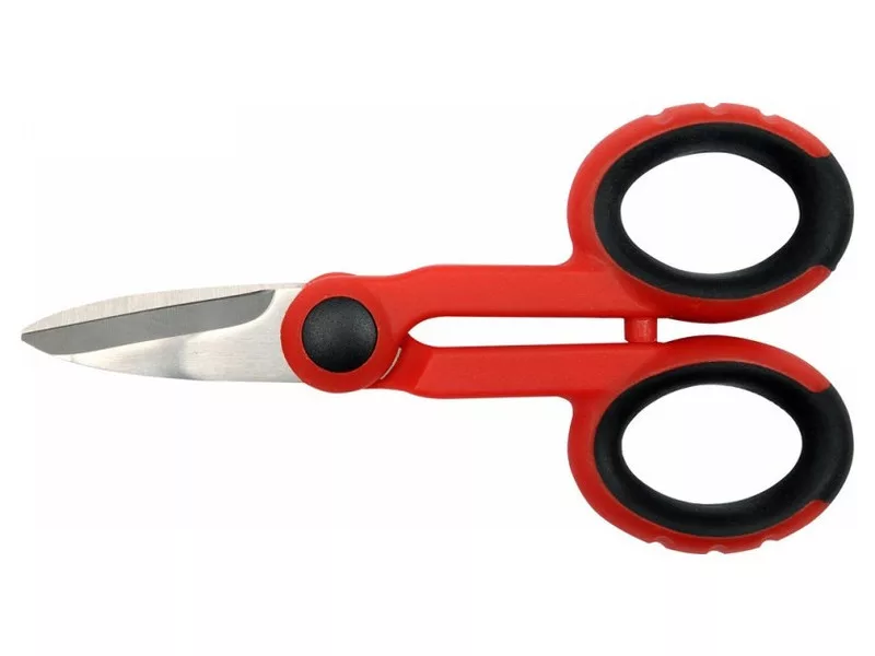 Scissors for electricians. Blades intended for cutting thin wires, insulation tapes of heat shrink tubes, etc. materials. Made of stainless steel with a symbol 3CR13SS. The working part is hardened to 52-56 HRC. Most of the scissors covered with a layer of insulating plastic. Handles additionally covered with TPR inserts. Total length 140 mm. For auxiliary work for electricians and electricians.
