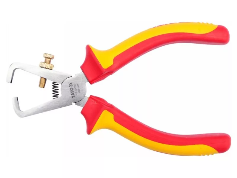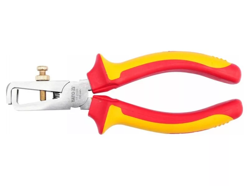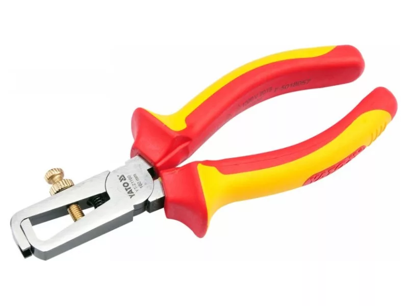 Cable wire stripping pliers YT-21160 with VDE insulation, made of high-grade CrV steel. V-shaped blade design that combined with the adjusting screw and opening spring do an excellent job in quick and precise stripping