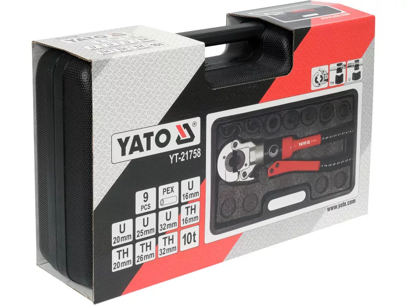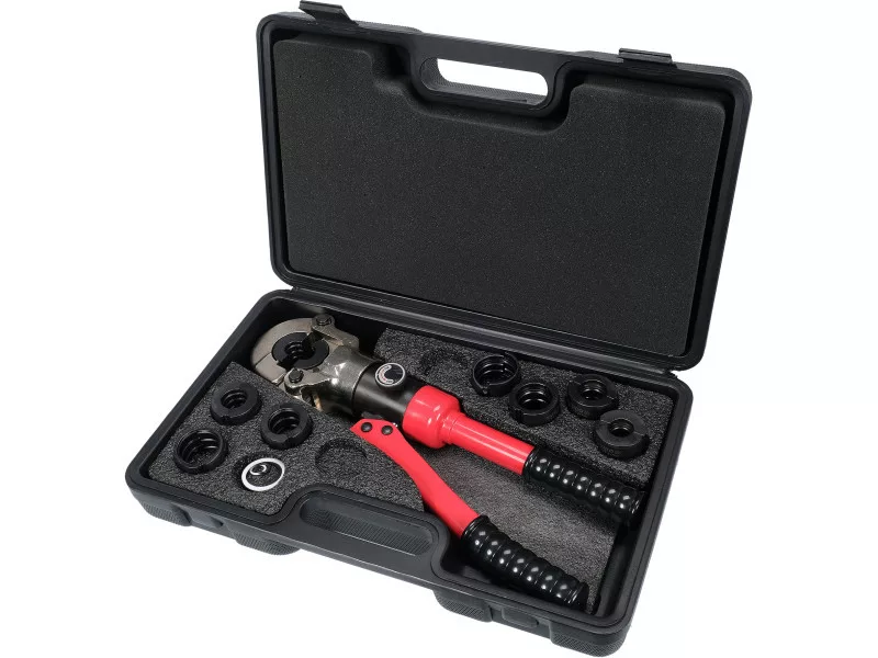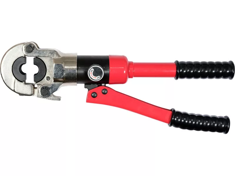 Handheld hydraulic press for crimping fittings on PEX-AL-PEX, PERT-AL-PERT pipes with a set of 8 dies. It is equipped with a hydraulic actuator that allows you to precisely and tightly crimp fittings with a pressing force of 10T. The quick die change system allows easy replacement of dies.