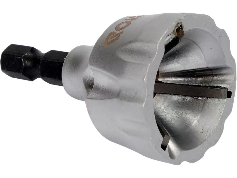 External deburrer- a cutter designed for rounding, smoothing metal parts, wood, etc. The main applications are rounding of threaded ends in screws or rods , removing burrs from the outer edges of tubes , mandrels or dowels. Install the hexagonal mandrel in the chuck of the drill , slide the working part on the workpiece . As it rotates , the inserts mounted inside will cut the material and smooth its surfaces .