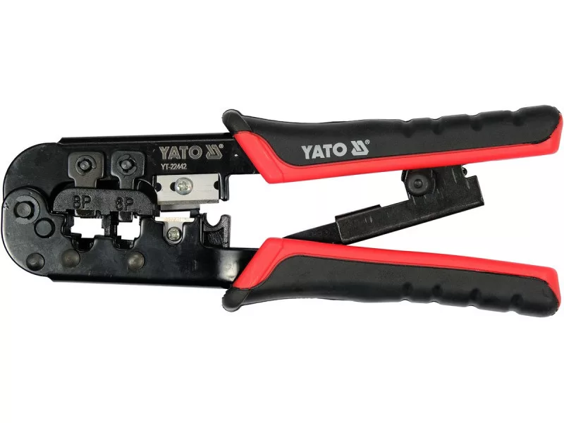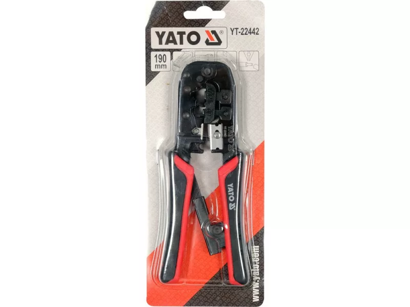 PinchesYT-22442 with ratchet mechanism for crimping telephone and network terminals. The pliers are made of carbon steel subjected to an oxidation process thatóry protects against corrosion. Two-component plastic handle caps. The harder PP component firmly adheres to the body, while the TPR outer part is pleasant to the touch and has anti-slip properties