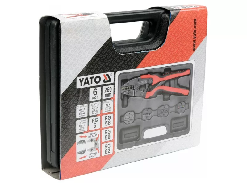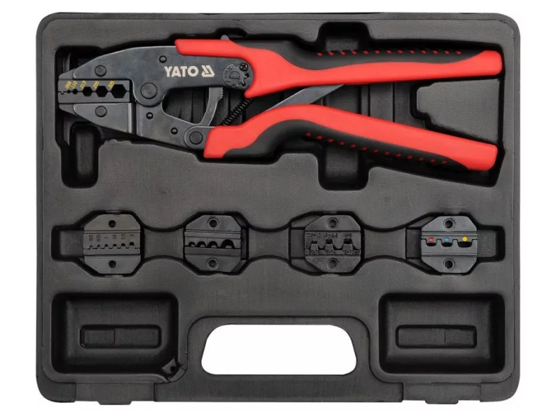 The pliers YT-2245 for crimping the most popular typesóof connectorsówith a blackened surface that protectsóagainst corrosion and two-component plastic handle caps. The precision jaw design facilitates the initial placement of the connector, while the longer-than-standard handles and the ratcheting mechanism clamp it precisely and firmly without using a lot of force.