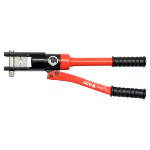 Hand press with a hydraulic cylinder. Designed for effective tightening of the tips on electric wires or for tightening of ropes. Thanks to the hydraulic actuator, clamping large tips does not require effort. Characteristic features of the YATO brand - Matrix blocking resistance bile - divided tightening matrix - piston - rotary cylinder head - actual valve of the actuator - moving the actuator arm - handle cover range. = 470mm Pressure: 18-20t Size of clamping jaws (MM2): 16; 25; 35; 50; 70; 95; 120; 150; 185; 240; 300