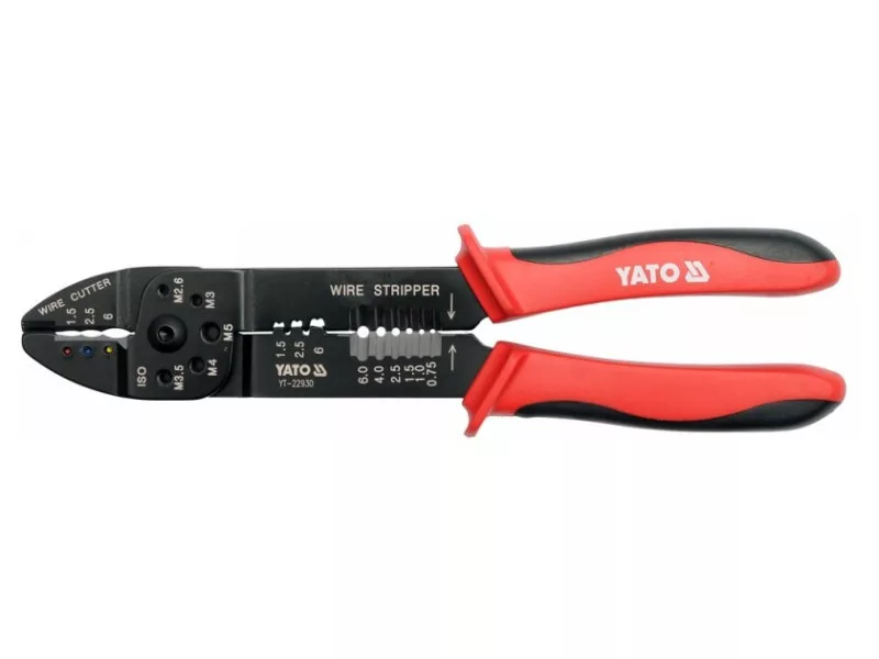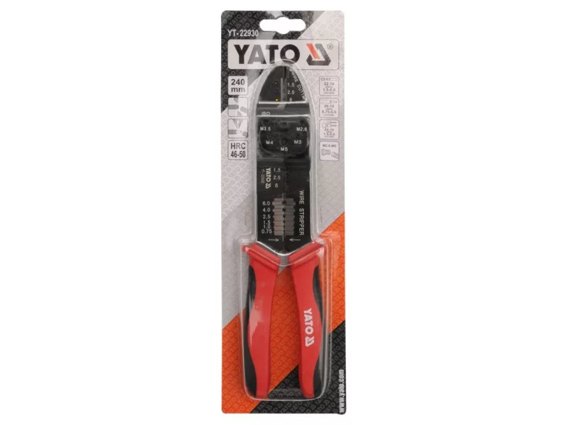 Pliers YT-22930 made of thick hardened steel with a blackened surface that protects against corrosion. Handles protected by two-component plastic overlays.