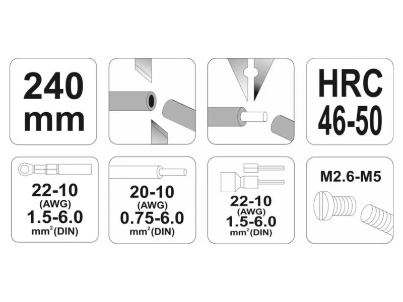 - ability to strip insulation from round wires in the range from 0.75 mm2 to 6.0 mm2