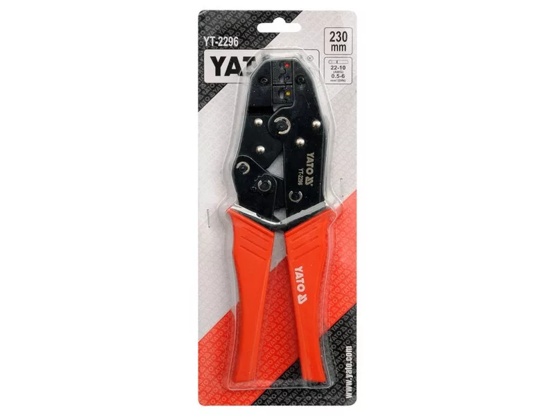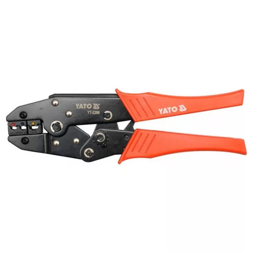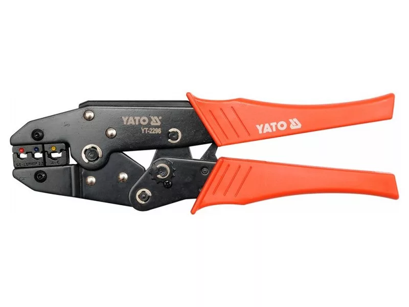 The YT-2296 pliers for crimping insulated connectors, with a blackened surface that protects against corrosion and plastic handle caps. The ratcheting mechanism allows quick and precise clamping without excessive force.