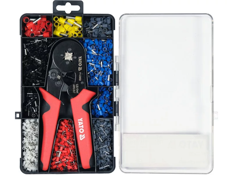 Pincers for crimping sleeve connectors on wires from 0.25 to 10 mm2 and 1200 pieces of sleeve type connectors. The pliers have a ratchet mechanism and are made of carbon steel. The blackened surface protects against corrosion. The four-piece sleeve clamp is made of tough 65Mn spring steel hardened to 50 HRC. The two-component handle caps are made of plastic. The harder PP component firmly adheres to the body, while the TPR outer part is pleasant to the touch and has non-slip properties.