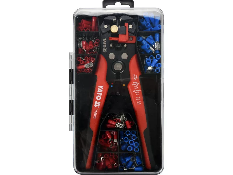 Set of insulated connectors with multifunctional pliers YT-23133. The body of the pliers is made of A3 steel, and the insulation stripping elements are made of durable hardened Cr12MoV alloy tool steel. The handles are protected by two-component plastic caps. The harder PP component grips firmly to the body, while the TPR outer part is pleasant to the touch and has non-slip properties. The pliers have been protected from corrosion by an oxidation method. The design of the pliers makes it possible to strip insulation from both the ends and the center of the wire. The depth stop works well when installing wires, such as in connectors or wago cubes.