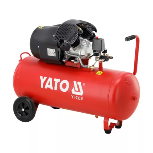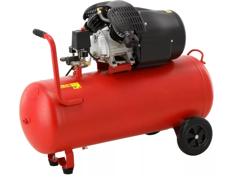 Two-cylinder air compressor with two connections and pressure control. Used for driving compressed air equipment, blowing boreholes and cleaning surfaces in industry, workshops, agriculture, construction sites.