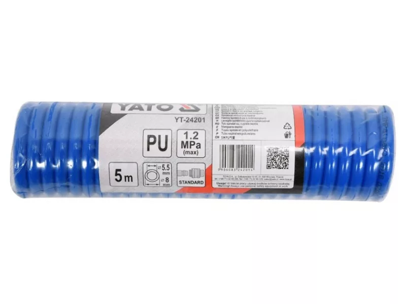 Professional spiral pneumatic hose terminated with quick disconnects. The 5.5x8 mm hose with a length of 5 meters is made of resistant polyurethane. The hose is resistant to low and high temperatures, so it can also be used outside the workshop.
