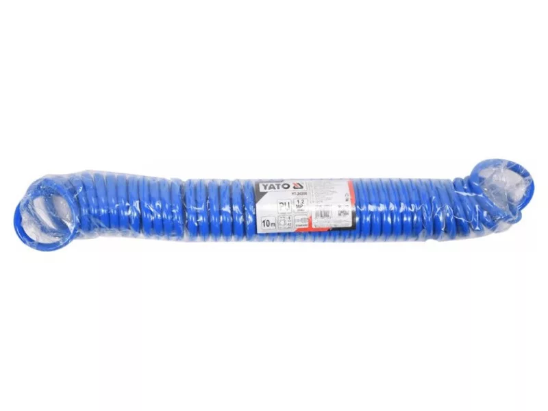 Professional spiral pneumatic hose terminated with quick disconnects. The hose measures 8,0x12 mm with a length of 10 meters and is made of resistant polyurethane. The hose is resistant to low and high temperatures, so it can also be used outside the workshop.