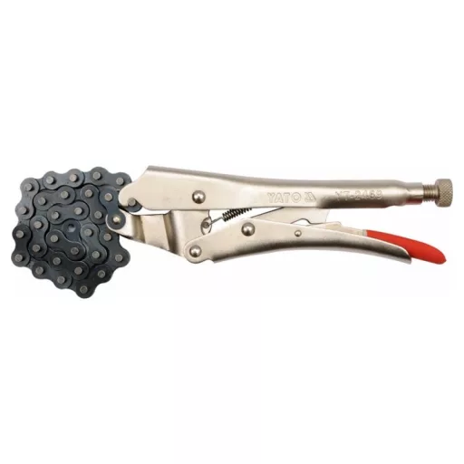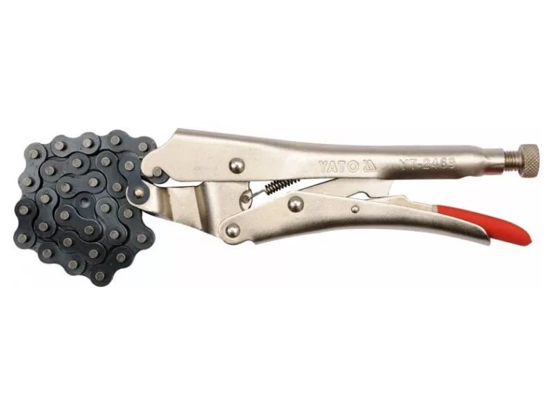 Chain welding pliers. Total length of pliers 250mm. They have a screw adjustment of the opening enabling the adjustment of the jaw spacing depending on the size of the grafted material - max chain length 500mm. They have a European type closure. Nickel plated surface.