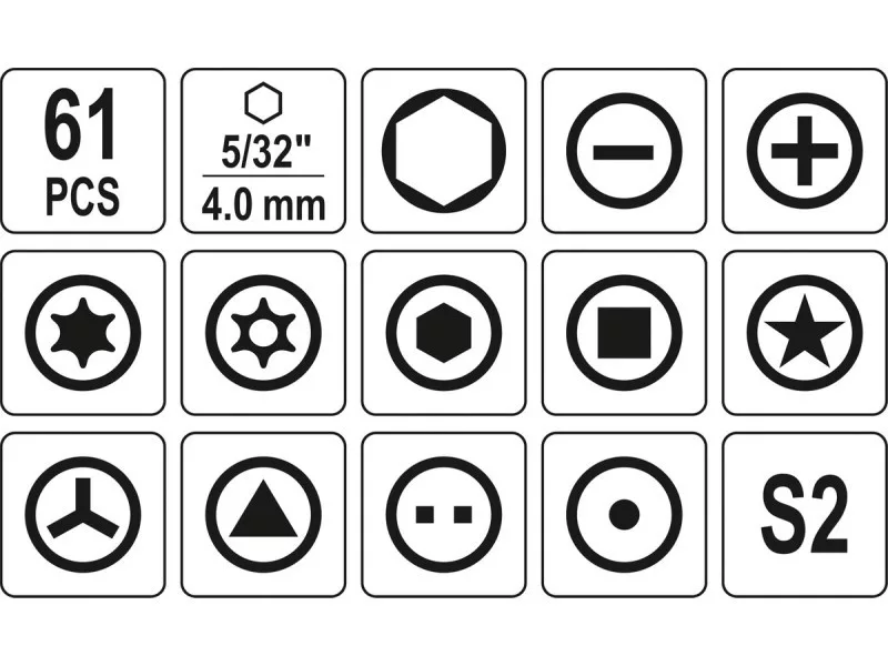 | Tip | flat, Phillips (PH), Torx, Torx TR, five-point Torx, hexagonal, square, Y-type, triangular, Spanner, punch |
