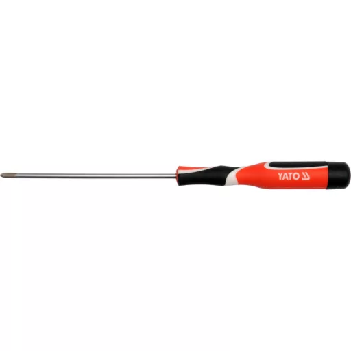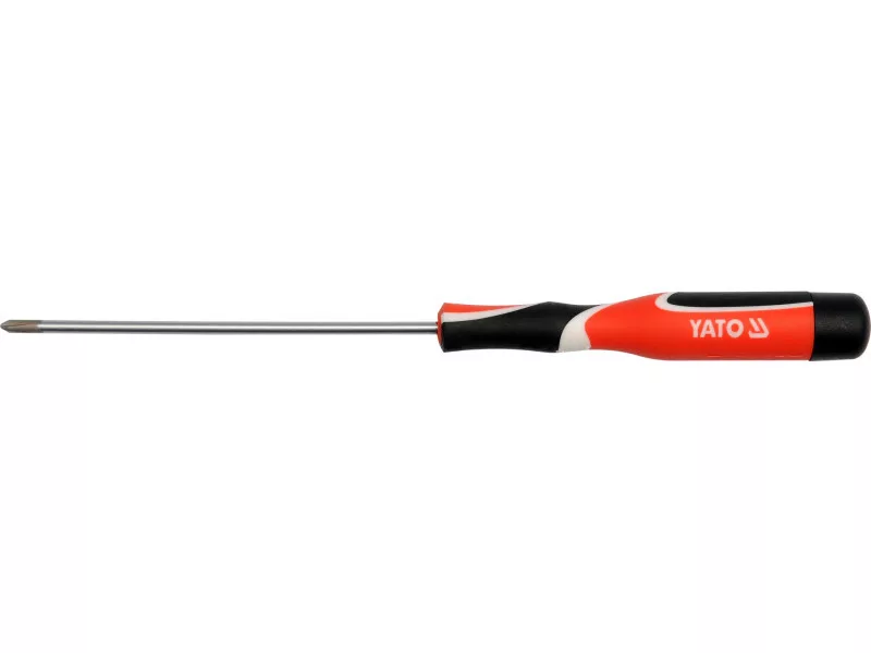 Precision screwdriver with hardened, sandblasted, magnetic working tip. For professional assembly work. Handle made in modern three component technology using three materials with selected hardness. The handle made in this way "holds in the hand" and reduces fatigue. The tip of the handle is finished with a movable, rotating overlay for facilitating screwing and unscrewing. For professional assembly work.